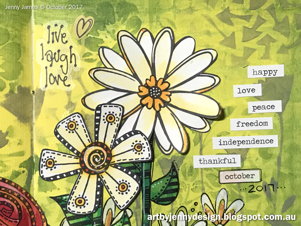 This page was created in my Jane Davenport 6x9 art journal using a few of my favourite things... watercolours, acrylic paint, stickers, stencils, die cuts, stamps and doodling. No theme, just a day playing in the studio!