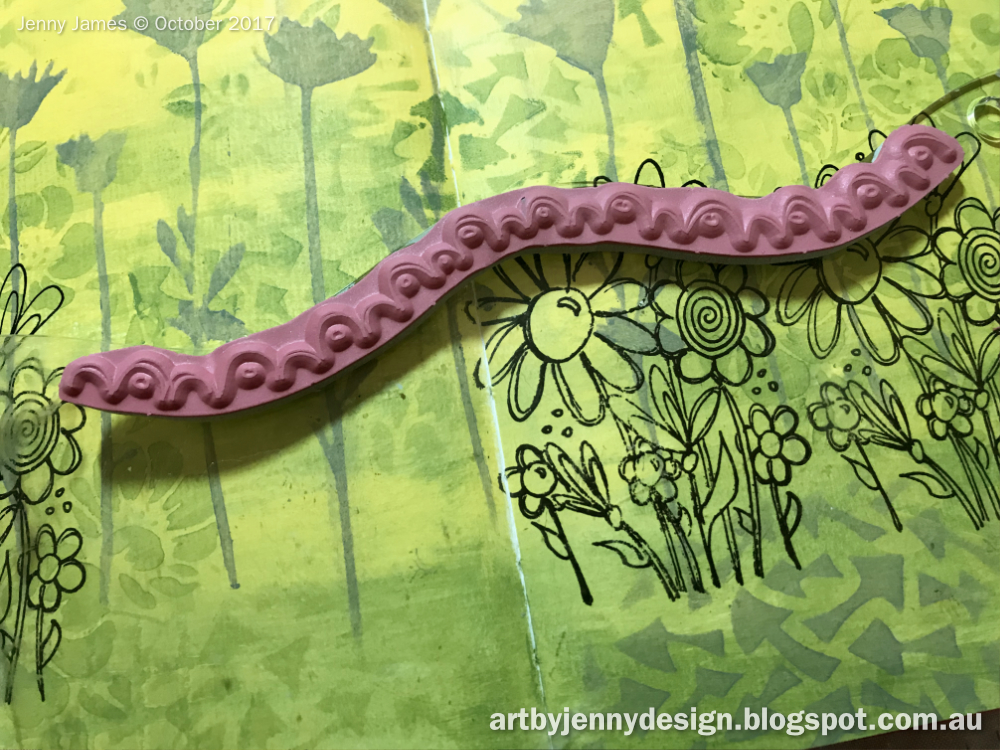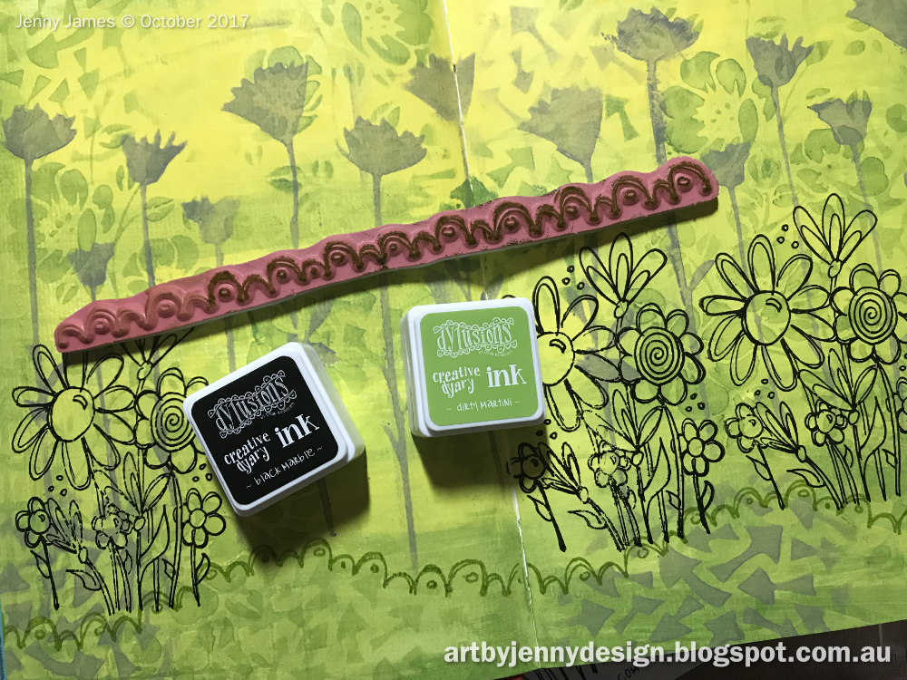 The border stamp is flexible so it can be shaped to the Dylusions Journal Block to create waves and hills on the page. I used the Dirty Martini Archival Ink Pad for this.