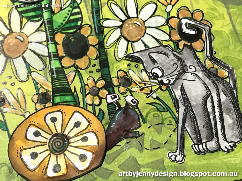 Here's the Crazy Cat with the snail.... the cat was coloured using only a wash of black watercolour paint. I used Winsor & Newton Professional Watercolour Art Sticks but any black or dark grey paint will give the same effect. You could use the black Mermaid Marker or the Dina Wakley Scribble Sticks :)