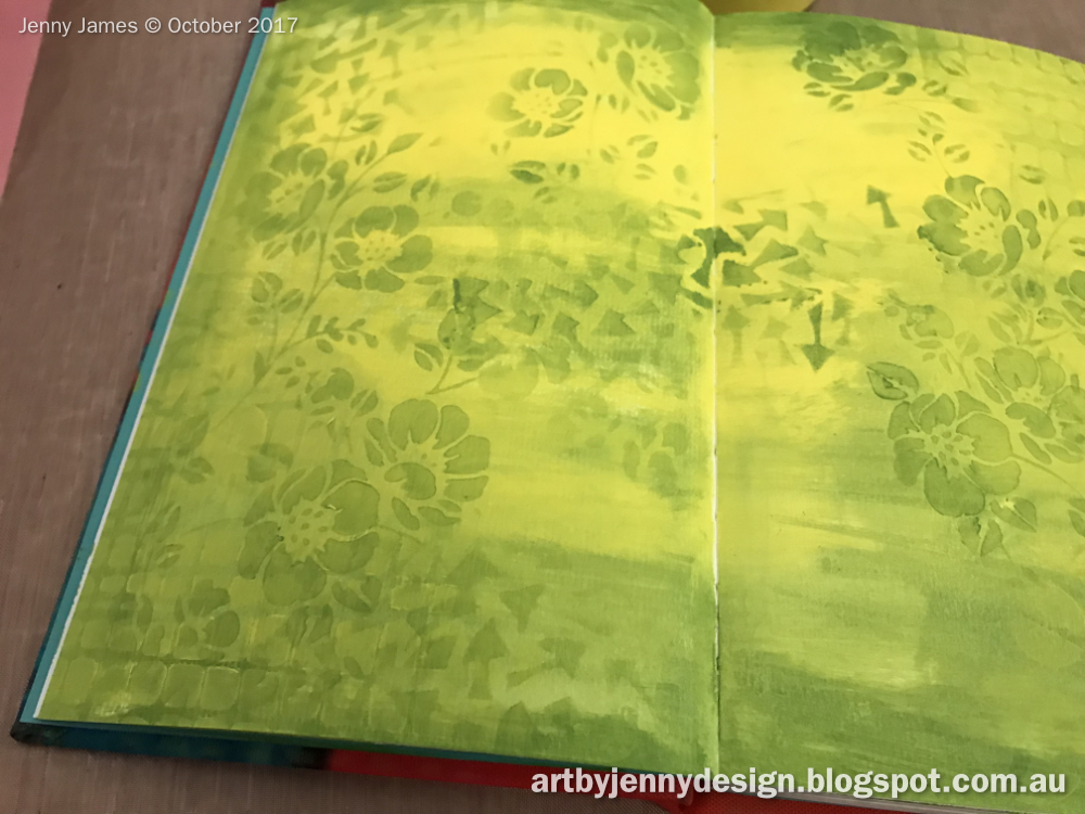 The stencils I used were Dylusions Arrows 5x8, Tim Holtz Roses and Screwed, as well as Darkroom Door Mesh 9x12. For these initial layers I only used green and yellow paint (Dirty Martini and Lemon Zest).
