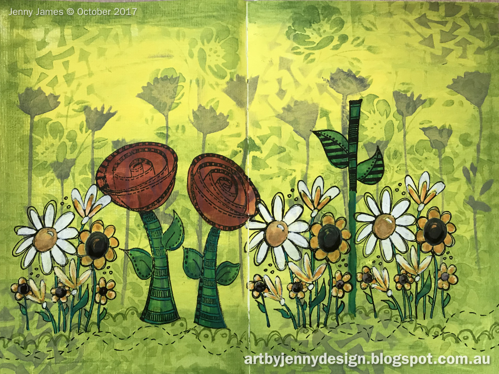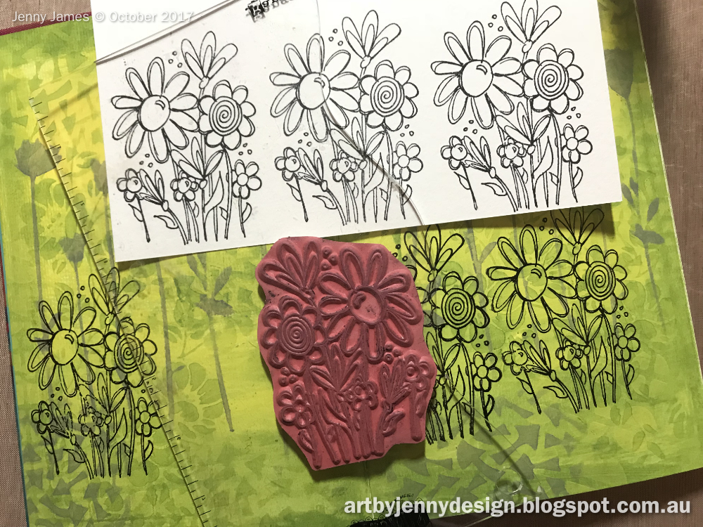 For the garden, I've used Dylusions stamp sets, Everything's Rosy and Anatomy of a Page. Using the black Archival ink pad from the Dylusions Creative Dyary Ink set, I stamped the flowers into the book and onto a sheet of watercolour paper.