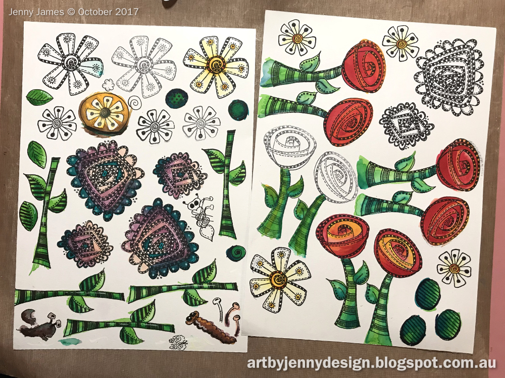I stamped heaps of the flowers and a few of the Tim Holtz Crazy Cat onto watercolour paper then decided I needed a snail and a different butterfly body. I always draw elements a few times so I've got plenty to choose from when I colour. If this pen is too thick for your tastes, check out the Jane Davenport Inkredible Pen. It draws beautiful fine lines. Both this Kuretake Pen and the Inkredible Pen are dye-based inks that will react to water - perfect for pen and wash drawings or adding shadows and depth.