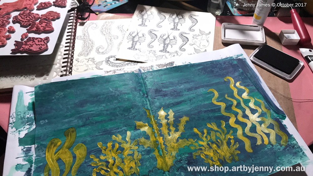 The seaweed, coral and ground (scalloped sea floor) were stamped directly onto the page using the Dylusions Ocean Backgrounds Stamp Set. After altering the plants and drawing more elements with a black marker, they were then painted with yellow acrylic paint.